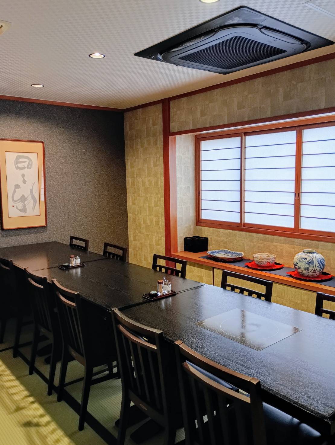 2Fのテーブル席では、宮崎牛A4ランクのサーロイン、リブロースを使用した、ステーキ、すき焼き、しゃぶしゃぶを。宮崎ブランドポークを使用したとんかつ、しゃぶしゃぶを。エビフライ好きにはぜひ食べていただきたい天然有頭大海老フライを。11~3月頃までは、活とらふぐのてっさと鍋のコースを。ご用意してお待ちしております。